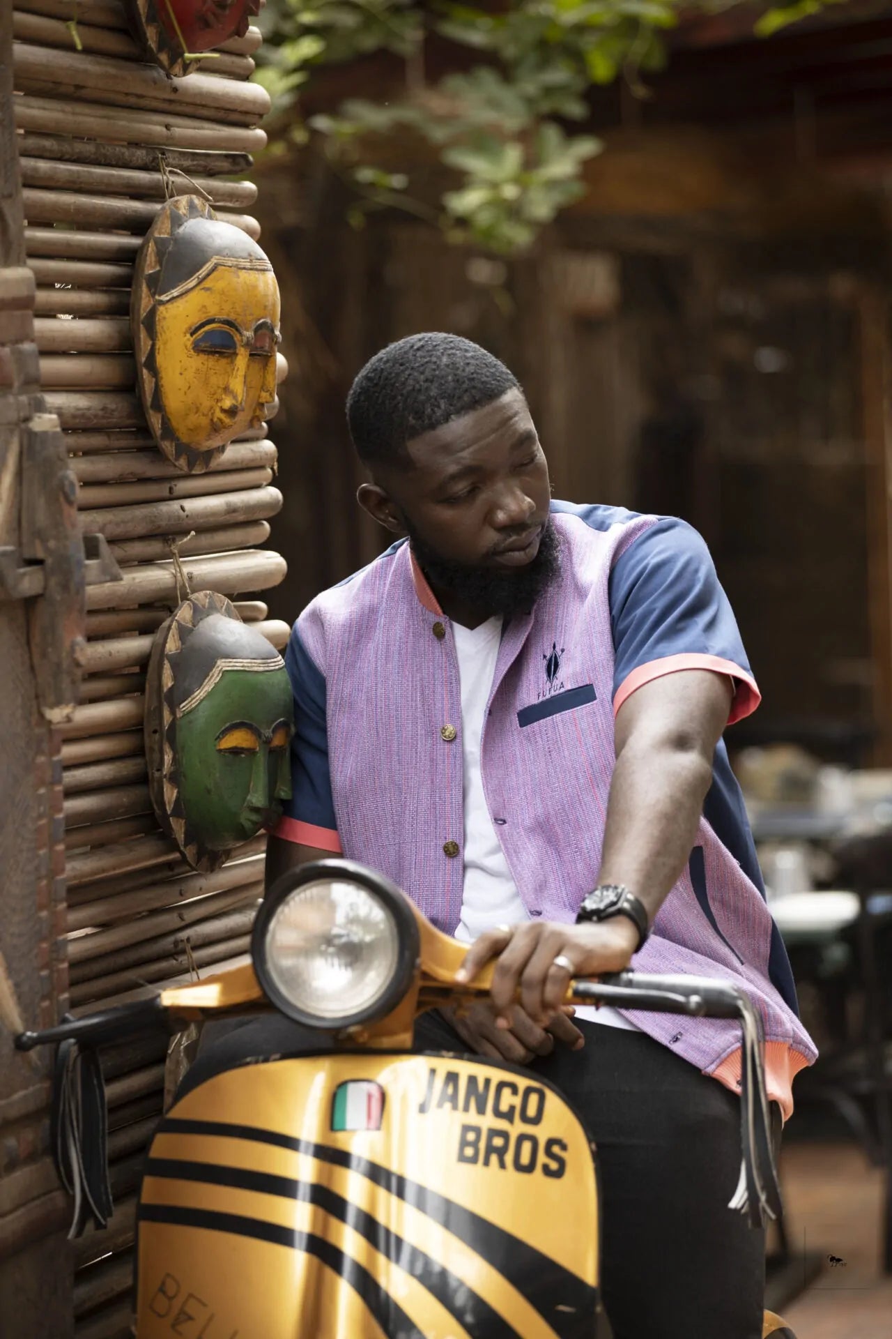 Designed for versatility, this lightweight jacket features a mandarin collar, gold-tone button closures, and a front pocket with a sleek Baule cloth accent, offering both style and functionality. The Fufua logo embroidered on the chest adds a finishing touch, symbolizing pride in African heritage and creativity.