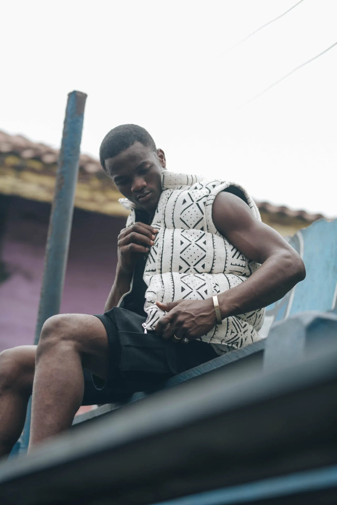 This sleeveless puffer jacket, crafted from authentic handwoven mudcloth, is a striking blend of traditional...