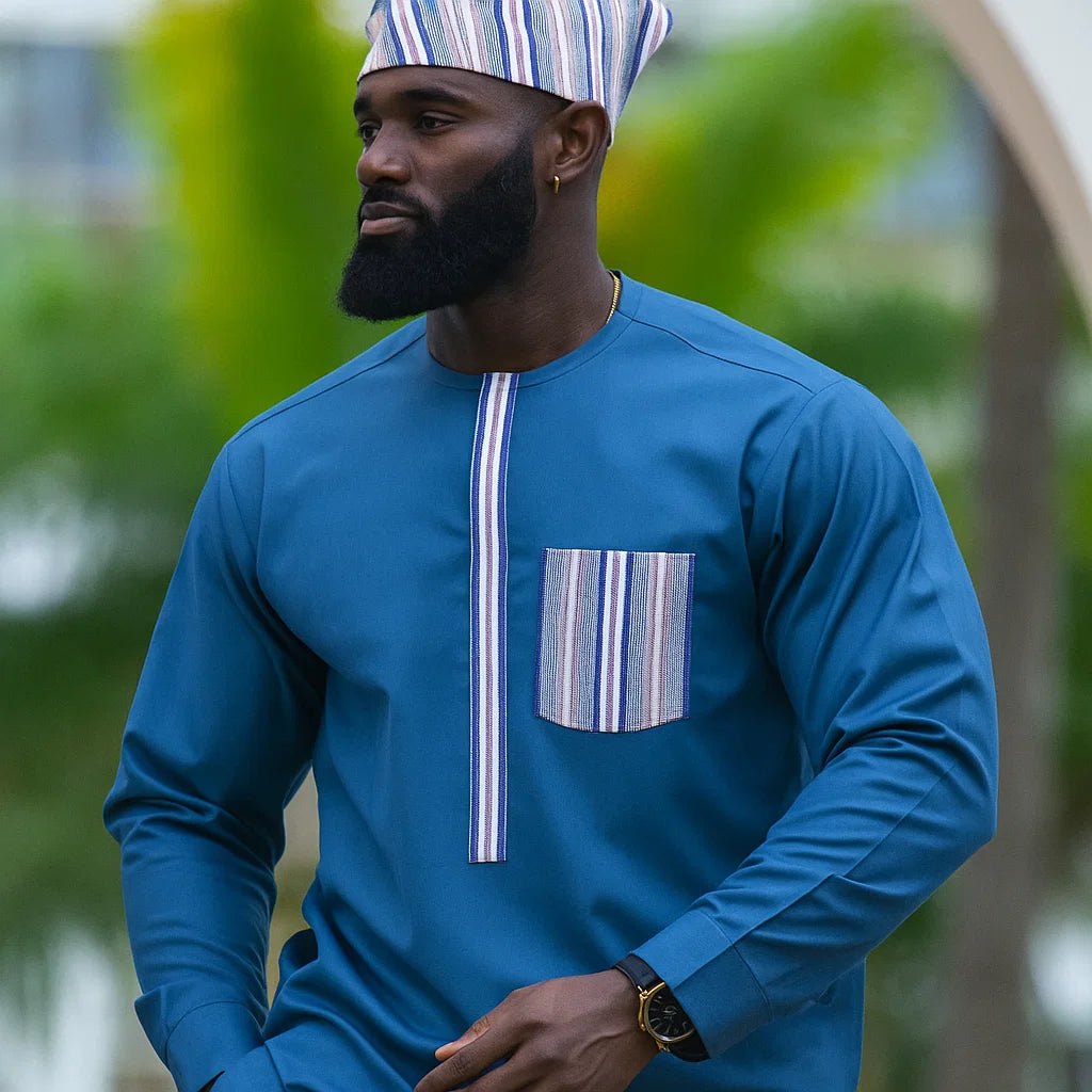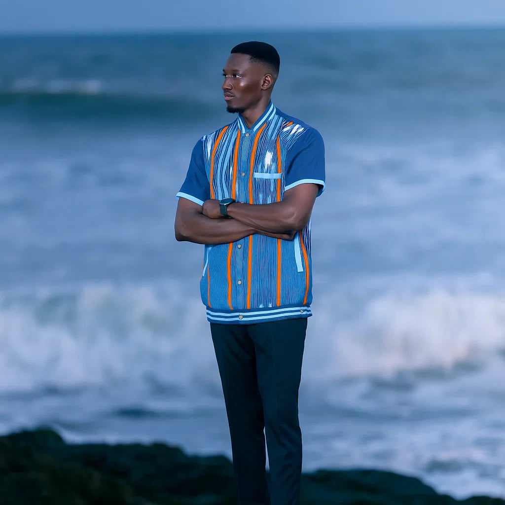 This short-sleeved shirt blends modern tailoring with African-inspired design elements. The vertical stripes in bright orange and cool aqua blue create a striking contrast, while the textured fabric adds depth and uniqueness. Finished with a neat Mandarin-style collar and wooden buttons, this shirt is perfect for stylish evenings and cultural gatherings.