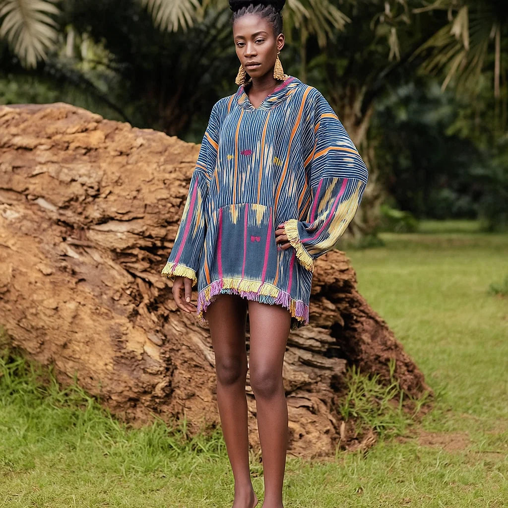 Crafted from rich woven fabric, this hoodie celebrates artisanal design with its colorful patterns and intricate detailing. The eye-catching mix of vertical stripes, ikat-inspired motifs, and tasseled edges highlights its cultural influence. Lightweight yet cozy, it’s the perfect piece to layer for transitional weather or to stand out at casual social events.