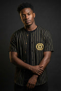 Inspired by iconic baseball jerseys, this piece blends structured pinstripes with the depth of kente cloth, creating a familiar form with a deeper story. Each jersey is finished with an embroidered Adinkra symbol, representing strength, resilience, and ancestral continuity.