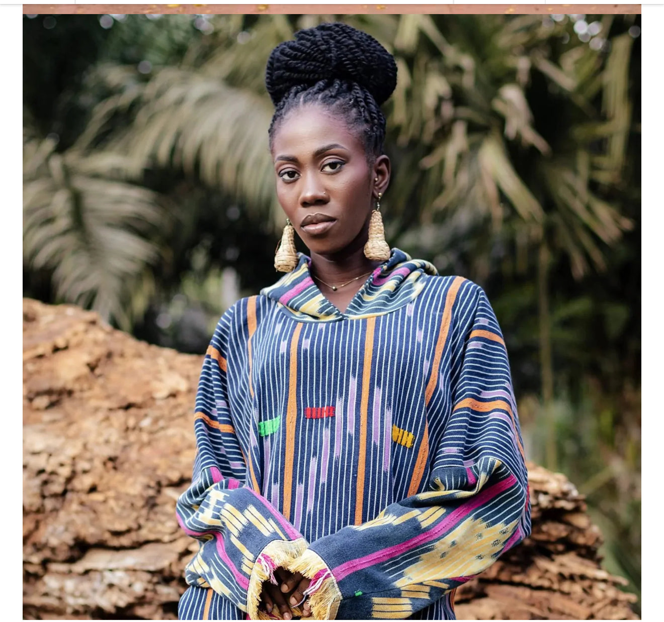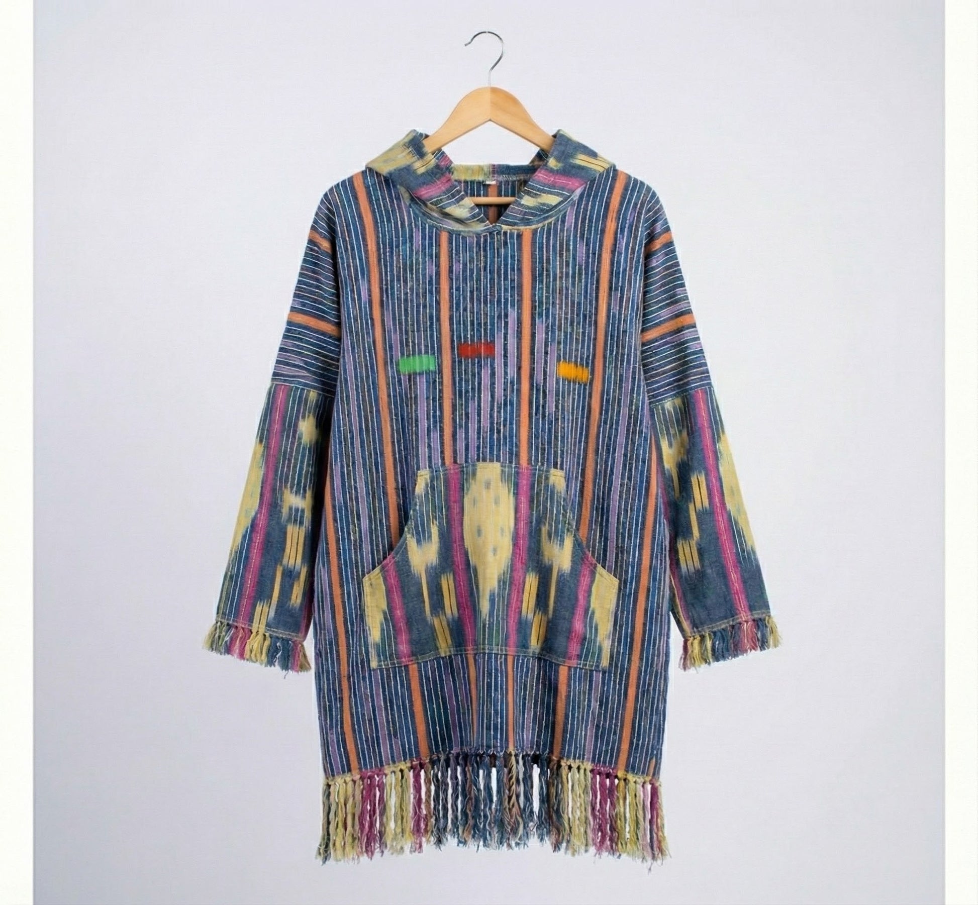Handwoven from authentic Baule cloth, this hooded tunic carries the quiet strength of West African textile tradition. Indigo-dyed stripes flow across the fabric, punctuated by subtle hand-dyed markings that make each piece feel alive and singular. The relaxed silhouette, finished with hand-fringed hems, drapes effortlessly on the body, offering comfort without losing presence. Designed as a lightweight layer, it sits at the intersection of heritage, artistry, and modern expression.