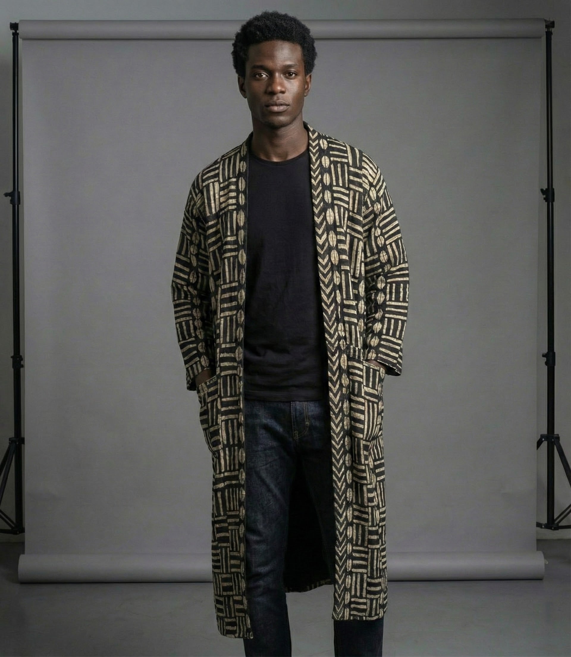 A long, open-front kimono crafted from authentic mudcloth, defined by hand-rendered geometric motifs and a relaxed, flowing silhouette. Designed for ease and versatility, it layers effortlessly over everyday wear while carrying the depth of traditional craftsmanship.