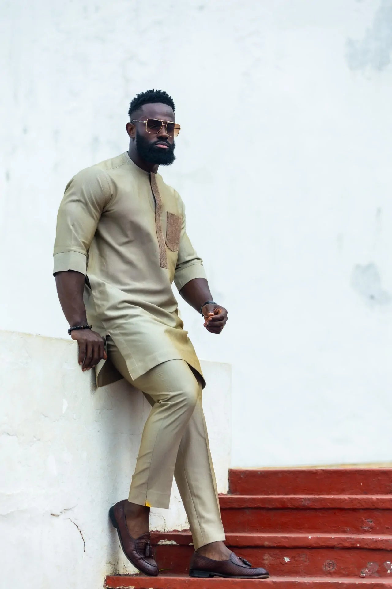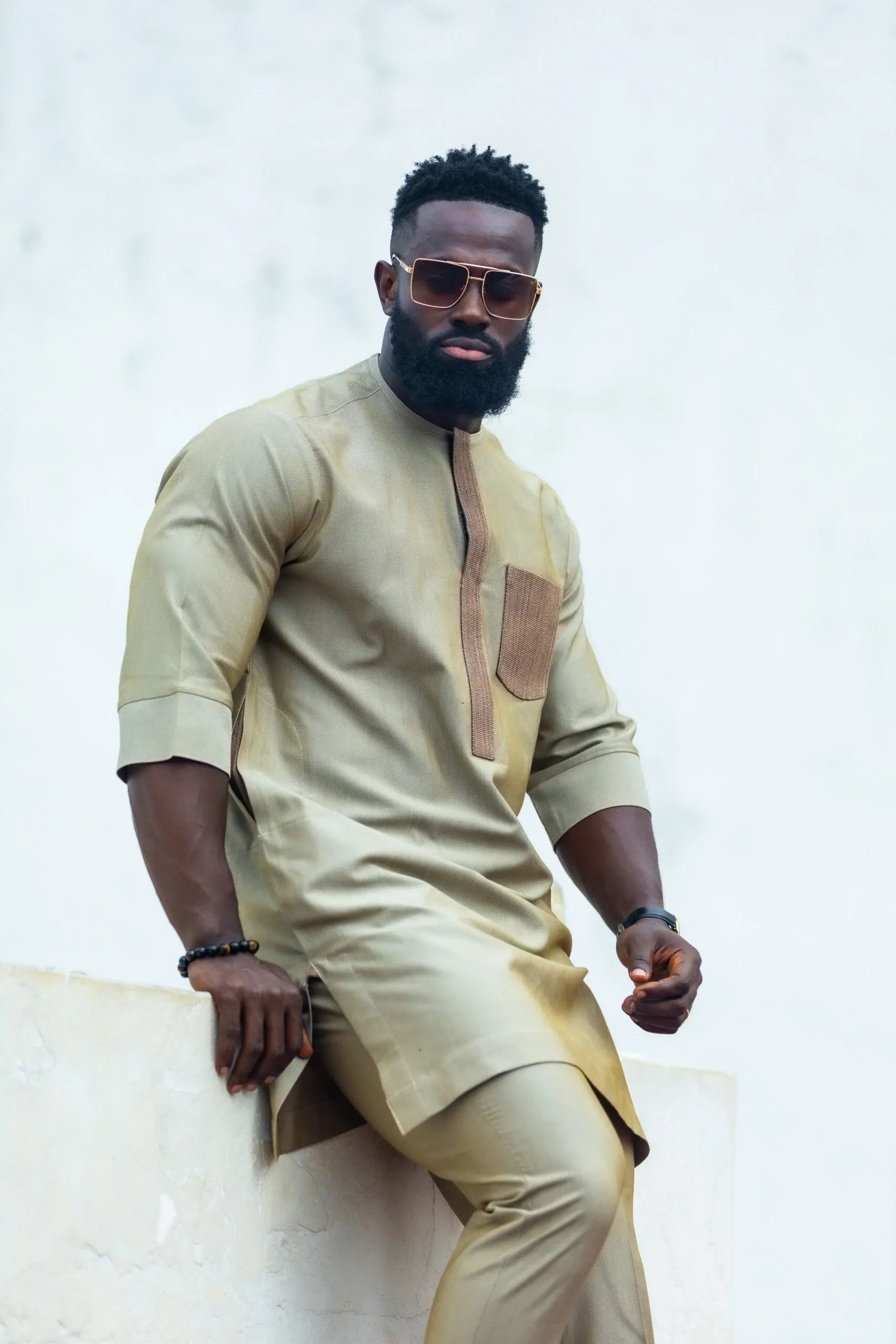Elevate your wardrobe with this refined kaftan set that blends simplicity with a subtle nod to heritage. The soft khaki-toned fabric offers a clean, modern aesthetic, while the pocket and front flap are adorned with handwoven Kente cloth for a tasteful cultural touch.