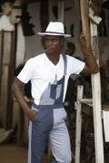 Make a striking style statement with these two-tone overalls, crafted from handwoven Kente fabric in contrasting shades of deep blue and light grey. The patchwork design creates a bold, modern aesthetic while celebrating traditional African craftsmanship. Designed with a relaxed fit, adjustable shoulder straps, and functional side and front pockets, these overalls offer both comfort and practicality.